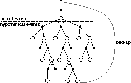 Rote learning and other aspects of Samuel's work strongly suggest the essential idea of temporal-difference learning---that the value of a state should equal the value of likely later states starting from that state. Samuel came closest to this idea in his second learning method, his ``learning by generalization" procedure for modifying the parameters of the value function. Samuel's method was the same in concept as that used much later by Tesauro in TD-Gammon. He played his program many games against another version of itself and performed a backup operation after each move. The idea of Samuel's backup is suggested by the diagram in Figure 11.3. Each open circle represents a position where the program moves next, an on-move position, and each solid circle represents a position where the opponent moves next. A backup was made to the value of each on-move position after a move by each side, resulting in a second on-move position. The backup was toward the minimax value of a search launched from the second on-move position. Thus, the overall effect was that of a backup consisting of one full move of real events and then a search over possible events, as suggested by Figure 11.3. Samuel's actual algorithm was significantly more complex than this for computational reasons, but this was the basic idea.