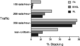 Figure 11.10: Performance of FA, BDCL, and RL channel allocation methods for different