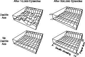 Consider the policy that sticks if the player's sum is 20 or 21, and otherwise hits. To find the state-value function for this policy by a Monte Carlo approach one simulates many blackjack games using the policy and averages the returns following each state. Note that in this task the same state never recurs within one episode, so there is no difference between first-visit and every-visit MC methods. In this way, we obtained the estimates of the state-value function shown in Figure 5.2. The estimates for states with a usable ace are less certain and less regular because these states are less common. In any event, after 500,000 games the value function is very well approximated.
