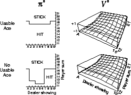 Figure 5.5 shows the optimal policy for blackjack found by Monte