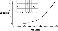 quickly over time. By 8000 time steps, the greedy policy (shown inset) was