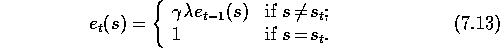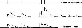 In some cases significantly better performance can be obtained by using a slightly modified kind of trace known as a replacing trace. Suppose a state is visited and then revisited before the trace due to the first visit has fully decayed to zero. With accumulating traces (7.5), the revisit causes a further increment in the trace, driving it greater than 1, whereas with replacing traces, the trace is reset to 1. Figure 7.16 contrasts these two kinds of traces. Formally, a replacing trace for a discrete state s is defined by