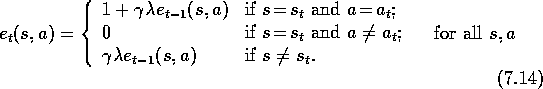 There are several possible ways to generalize replacing eligibility traces for use in control methods. Obviously, when a state is re-visited and a new action selected, the trace for that action should be reset to 1. But what of the traces for the other actions for that state? The approach recommended by Singh and Sutton (1996) is to set the traces of all the other actions from the re-visited state to 0. In this case, the state-action traces are updated by the following instead of (7.10):