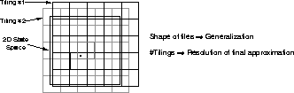 It is important to note that the tilings can be arbitrary and need not be uniform grids. Not only can the tiles be strangely shaped, as in Figure 8.6a, but they can be shaped and distributed to give particular kinds of generalization. For example, the stripe tiling in Figure 8.6b will promote generalization along the vertical dimension and discrimination along the horizontal dimension, particularly on the left. The diagonal stripe tiling in Figure 8.6c will promote generalization along one diagonal. In higher dimensions, axis-aligned stripes correspond to ignoring some of the dimensions in some of the tilings, i.e., to hyperplanar slices.