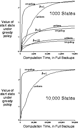 The upper part of Figure 9.14 shows results averaged over 200 sample tasks with 1000 states and branching factors of 1, 3, and 10. The quality of the policies found is plotted as a function of the number of full backups completed. In all cases, sampling according to the on-policy distribution resulted in faster planning initially and retarded planning in the long run. The effect was stronger, and the initial period of faster planning longer, at smaller branching factors. In other experiments, we found that these effects also became stronger as the number of states increased. For example, the lower part of Figure 9.14 shows results for a branching factor of 1 for tasks with 10,000 states. In this case the advantage of on-policy focusing is very large and long-lasting.